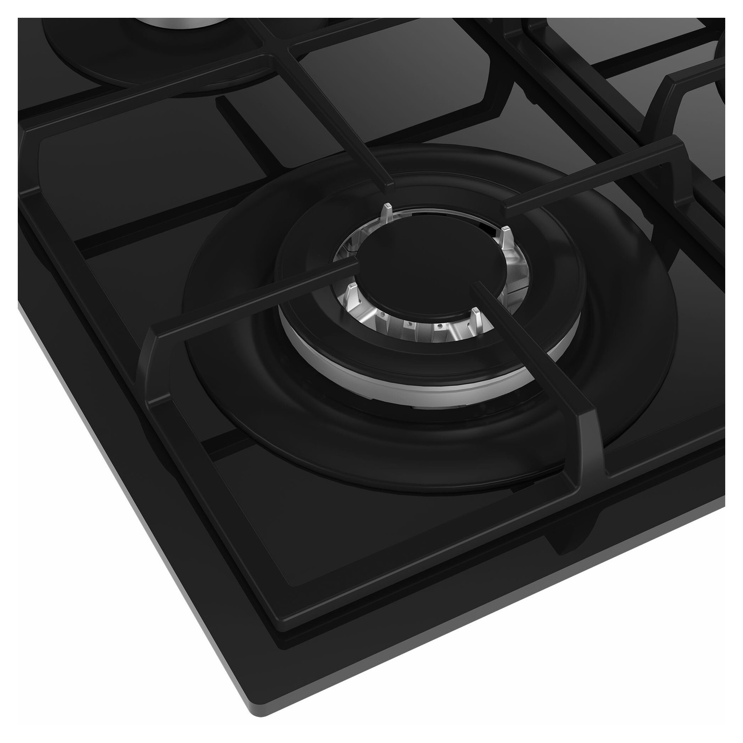Стеклянная панель с чугунными решетками хорошо смотрится в интерьере, а механические поворотные переключатели позволяют точно выставить уровень нагрева. В каждый из переключателей встроен автоматический электроподжиг, чтобы вы могли включать конфорки одной рукой, без спичек или зажигалки.