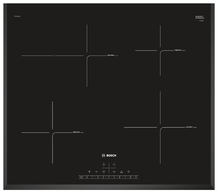 Электрическая варочная поверхность BOSCH PIF651FB1E в черном цвете включает в себя четыре индукционные конфорки. В качестве покрытия поверхности и конфорок используется стеклокерамика.