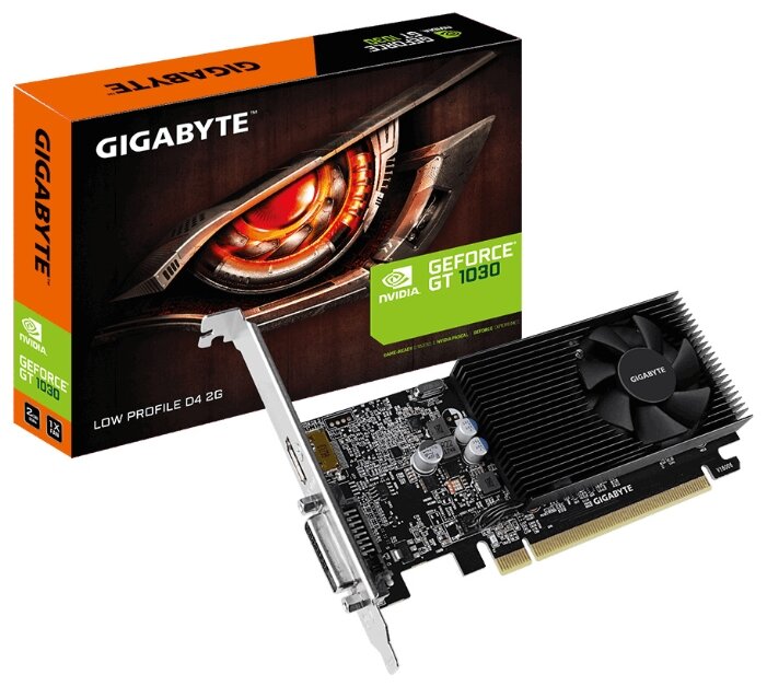 Видеокарта GIGABYTE GeForce GT 1030 Low Profile D4 2G [GV-N1030D4-2GL] имеет 2 ГБ памяти GDDR4. Используемый для установки видеоадаптера интерфейс – PCI-E. Видеоразъемы DVI-D и HDMI могут использоваться для одновременного подключения 2 мониторов. Максимальное разрешение, обеспечиваемое видеокартой – 4096x2160. Одним из преимуществ модели является крайне невысокое (лишь 20 Вт) энергопотребление. Рекомендованная производителем устройства выходная мощность источника питания равна 300 Вт.