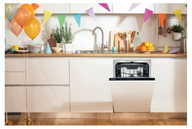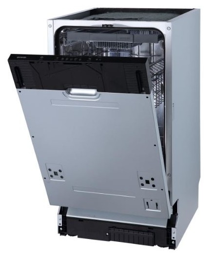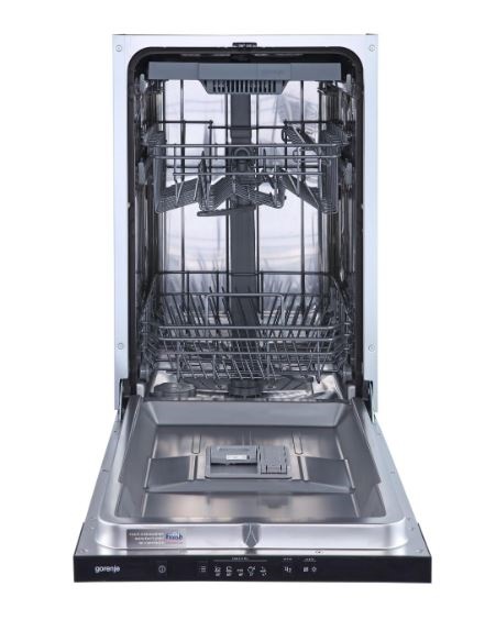 Встраиваемая посудомоечная машина Gorenje GV520E11 узкая модель, которая предусматривает навешивание фасада, что гарантирует полную интеграцию в кухонный гарнитур. Несмотря на то, что ее ширина составляет всего 45 см, она способна вымыть за раз 9 комплектов посуды, причем верхний короб можно регулировать по высоте, поднимая выше в случае необходимости разместить в нижнем крупногабаритный предмет, а часть держателей для тарелок могут складываться, образуя ровное пространство для его установки.